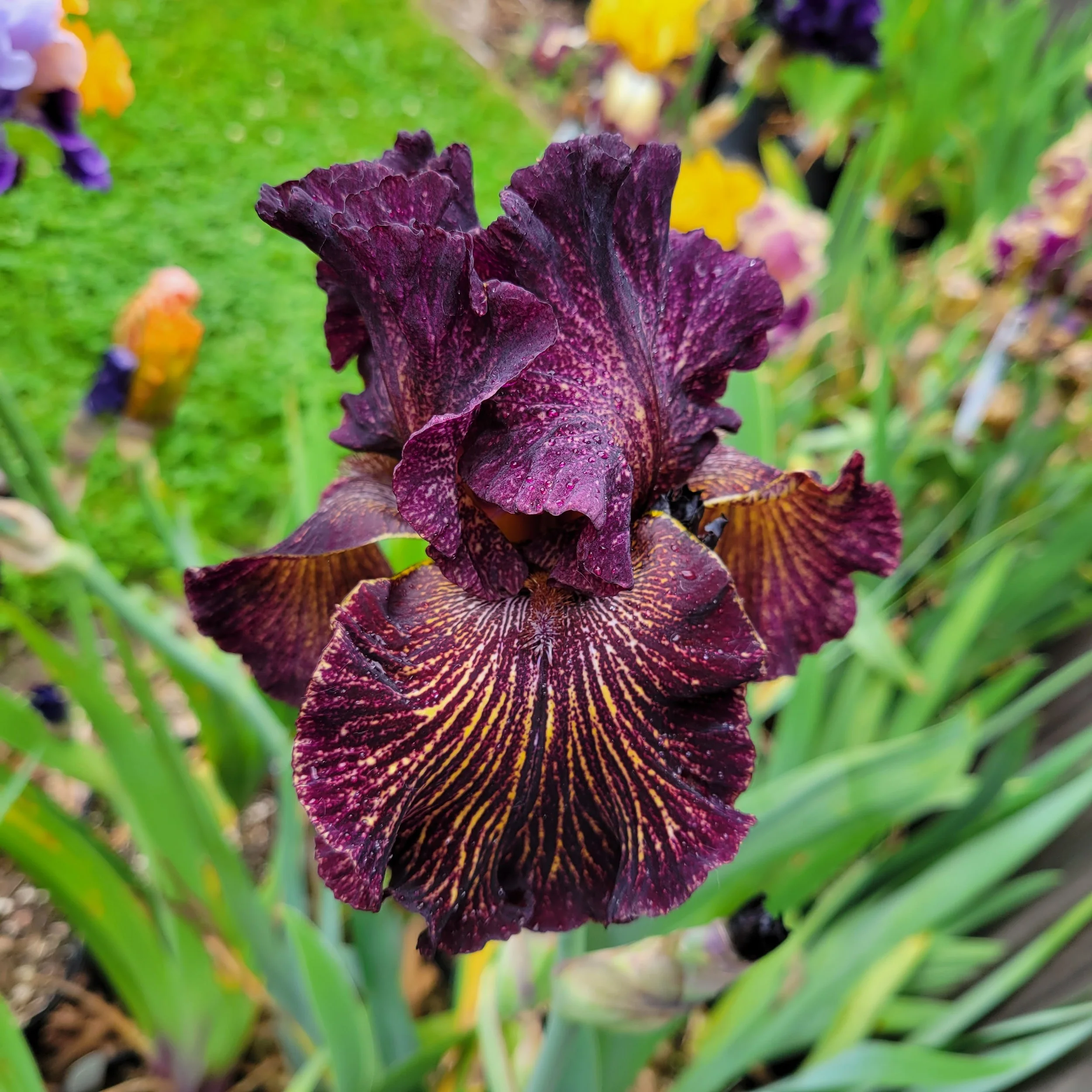 (K. Keppel, 2016) 35” Midseason bloom. Standards black-mulberry with lighter speckling toward the center; falls black-mulberry around margins, same black-mulberry overlaid in radiating stripes over bright yellow ground, which turns to white flanking the beards; beards based pale lavender, tipped with mustard-brown outside.