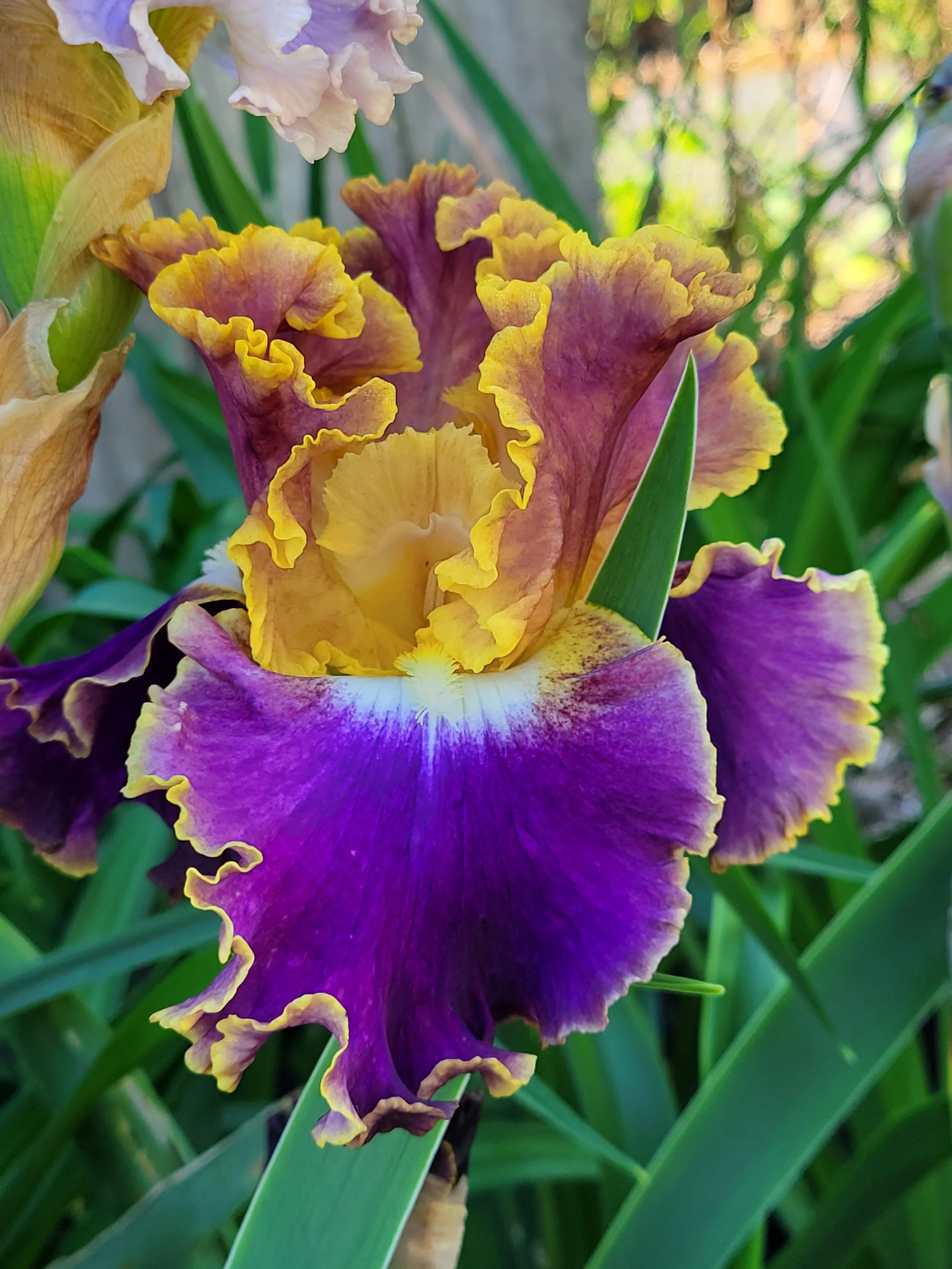 (K. Keppel, 2012) 35” Midseason bloom. Standards mauve with lemon outer edge band, intensifying toward base; falls plum-violet with gradual infusion of blue toward the center, narrow chartreuse-yellow band at edges, beards flanked with white; beards yellow at center, blanching at each end to white.