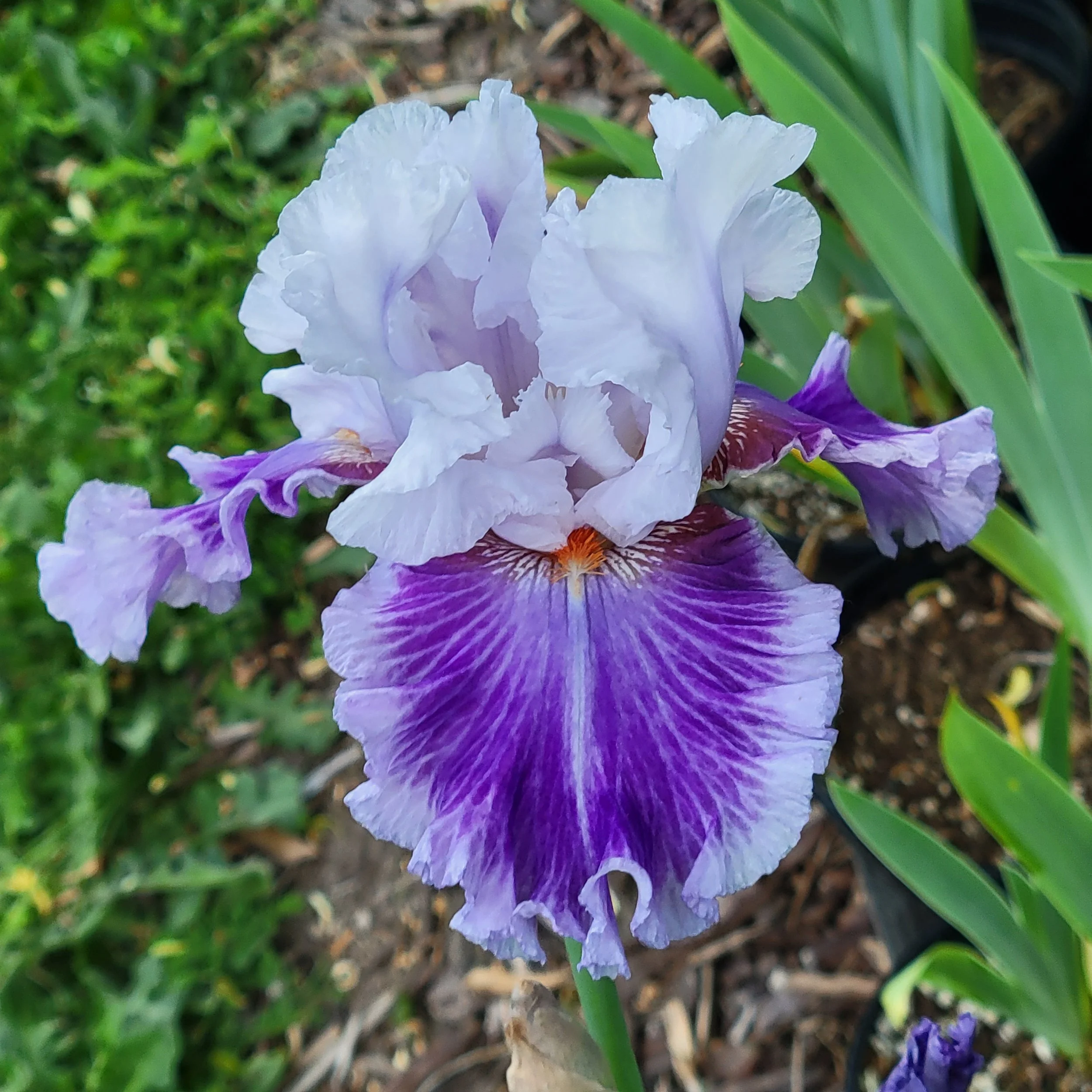 (B. Blyth, 2001) 44” Very early bloom. Standards icy lavender; falls plum-violet edged with a lavender band, hafts rust-red; beards tangerine.
